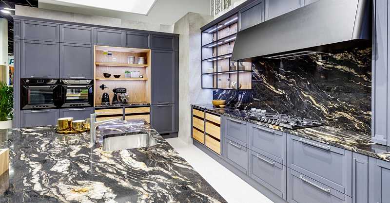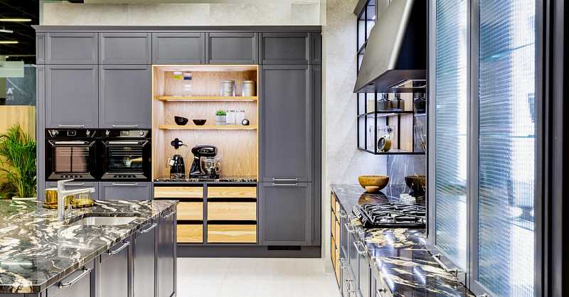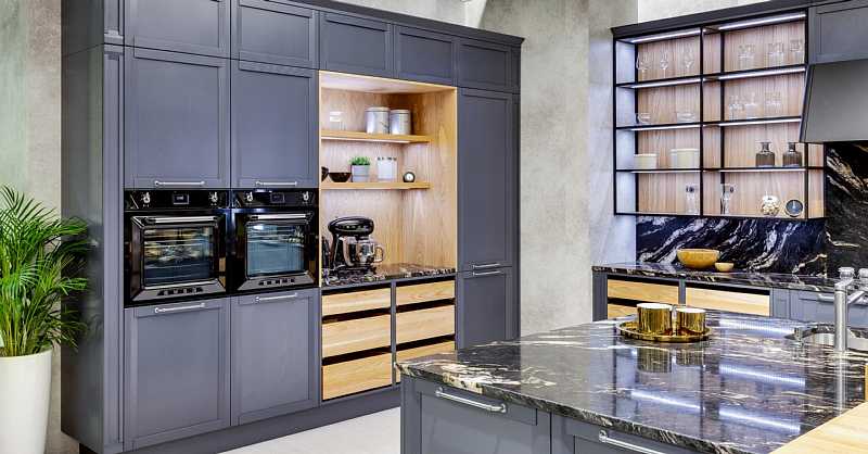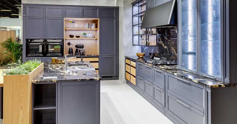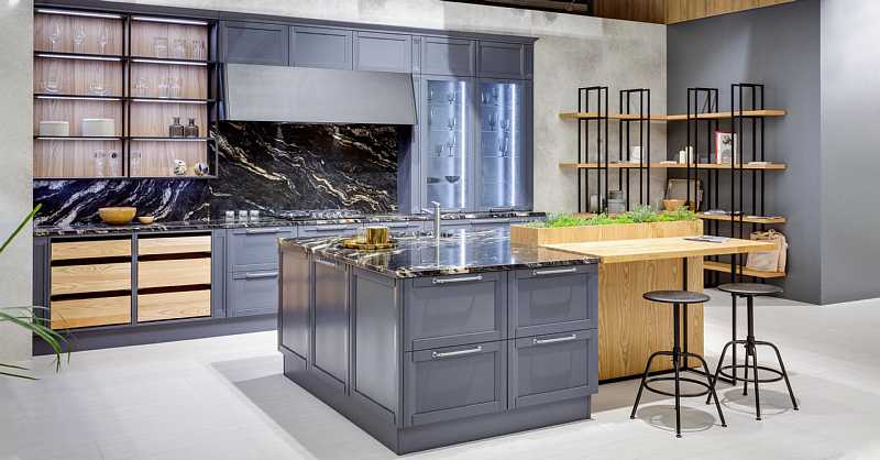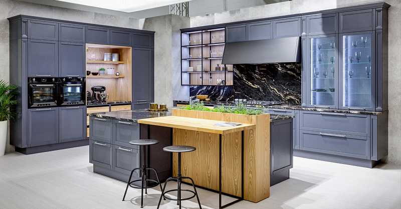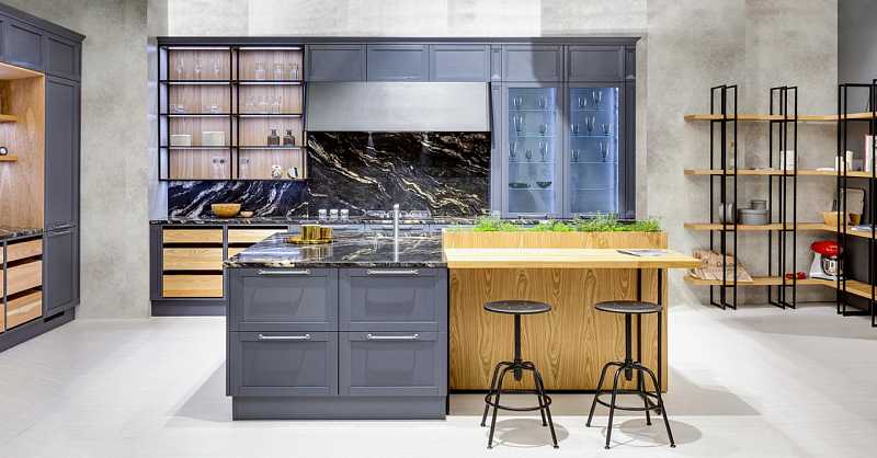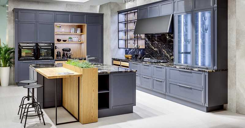 The delicate coating of oak doors allows you to enjoy the natural beauty of the wood texture. Clear straight lines of the classic solid oak frame door, real reinforced glass and an original hearth that imitates industrial extractor fan - all these stylistically different elements perfectly complement each other in texture, color, and shape. This kitchen was presented at the Living Kitchen 2019 exhibition in Cologne and was awarded the German Design Award 2020 by the German design Council.