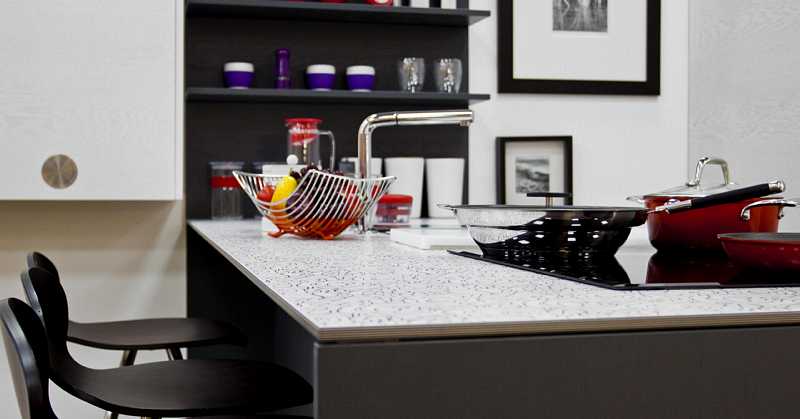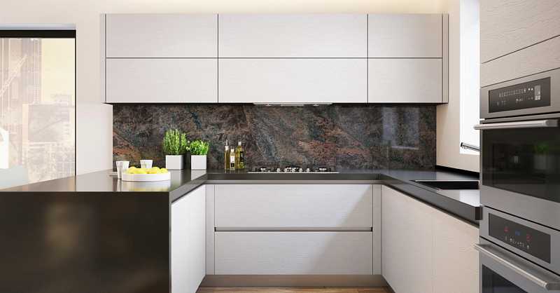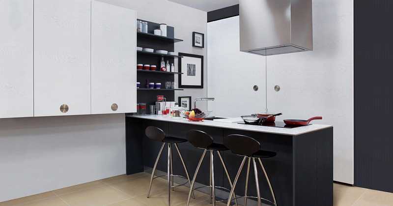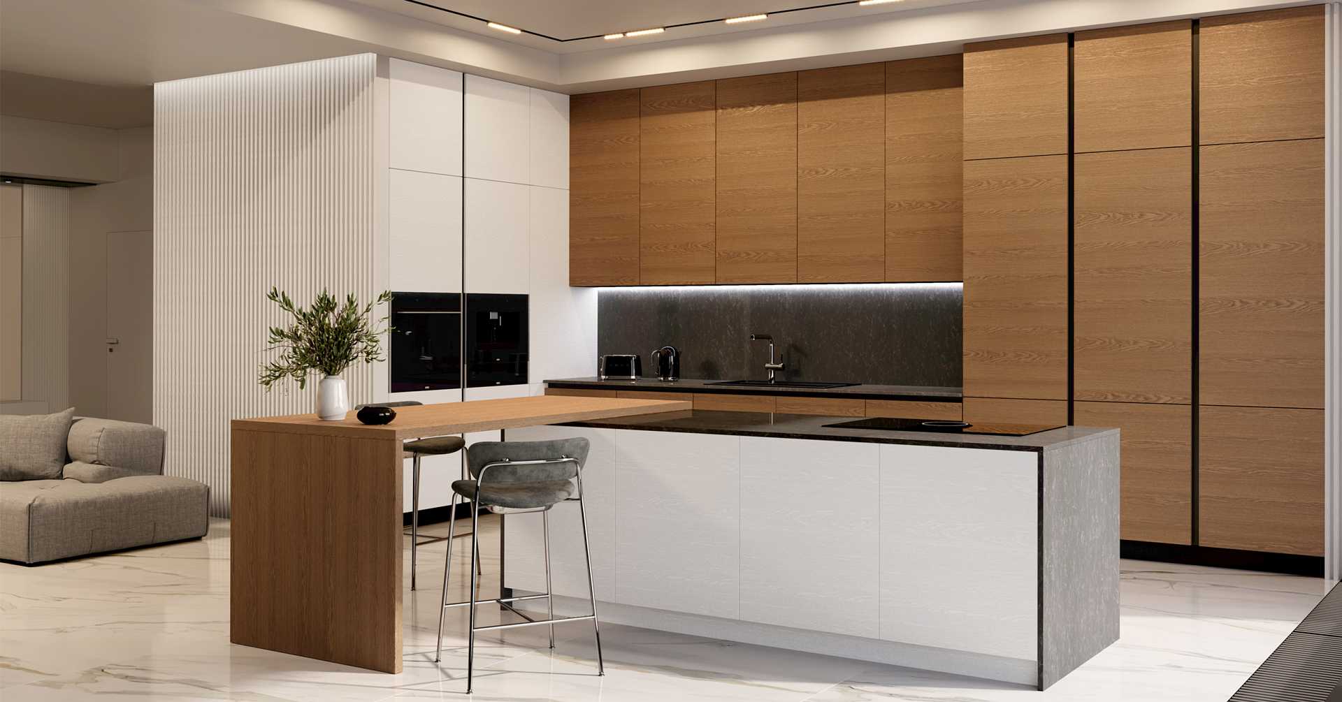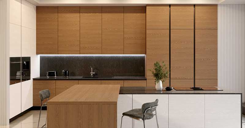 Crisp grain of horizontal oak veneer pattern visually expands the kitchen space. The opportunity to combine it with various colours and textures as well as regular lines of internal handle in the upper or lower part of the front side make the model distinctly laconic.