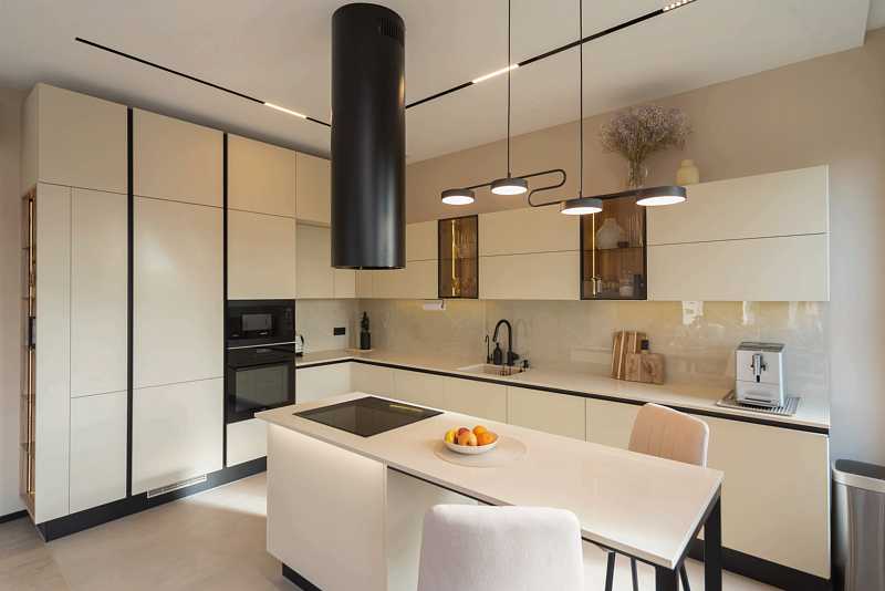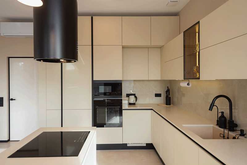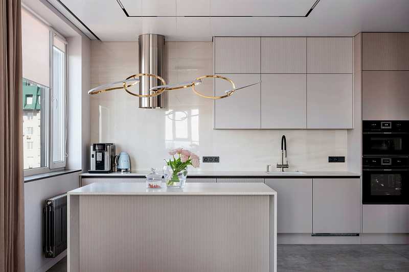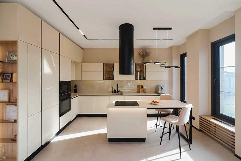 The latest ultra-matt, pleasant-to-touch door coating can be made in a wide range of colors in the NCS and RAL catalogues. A special filler makes the surface texture and more resistant to scratches. The perfect combination of straight and rounded elements, ergonomic hidden handles create a concise appearance of the kitchen.