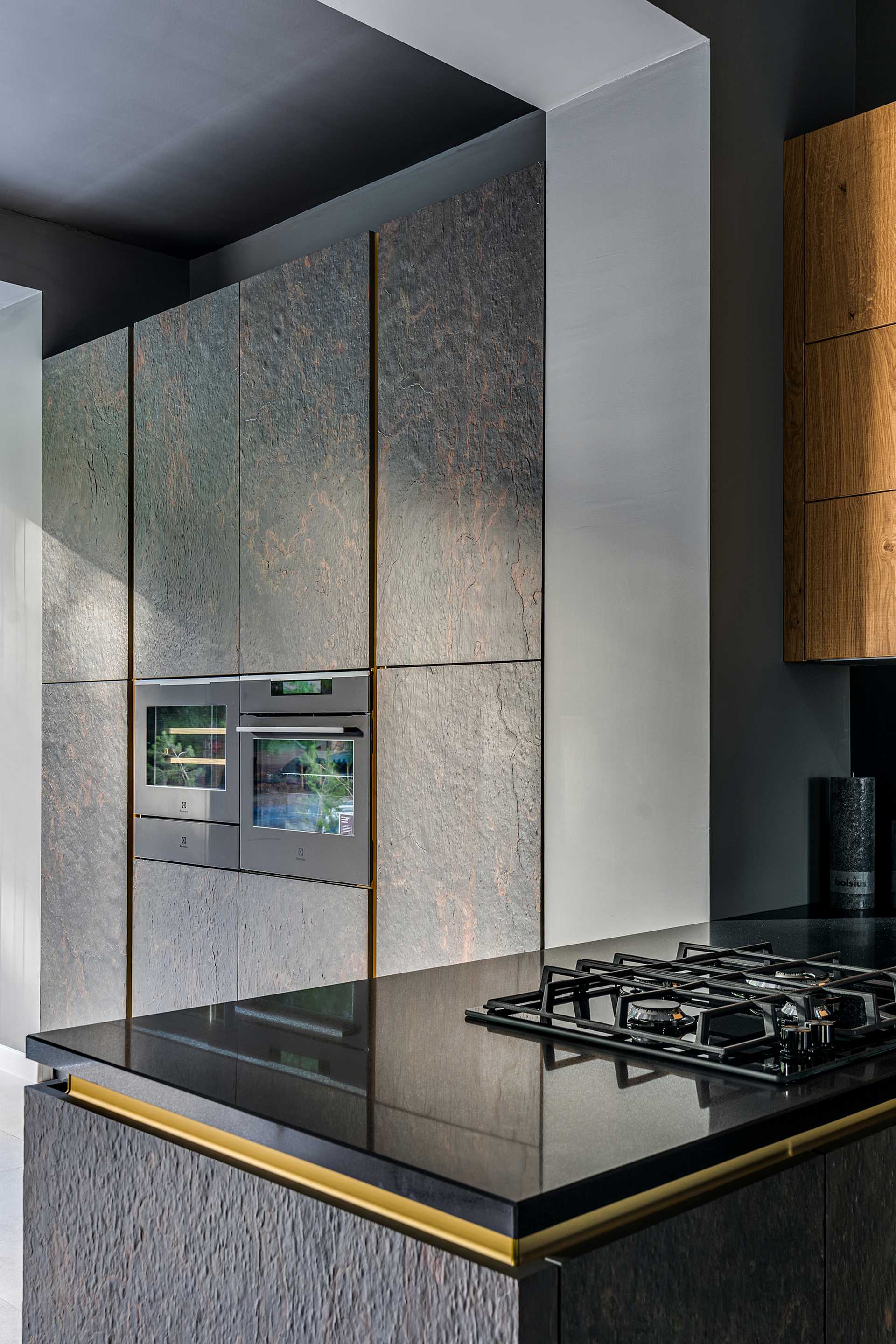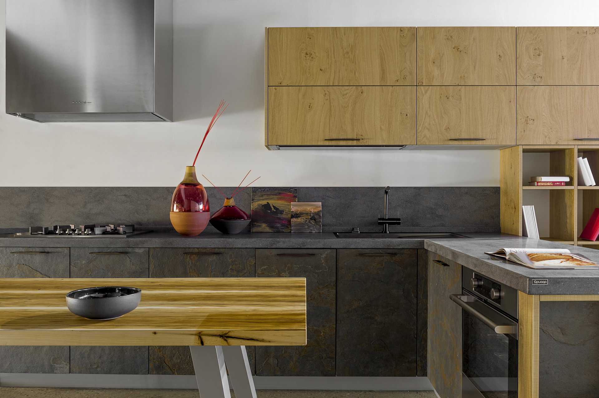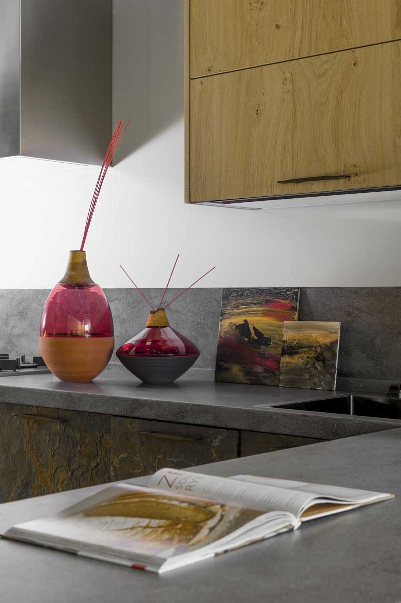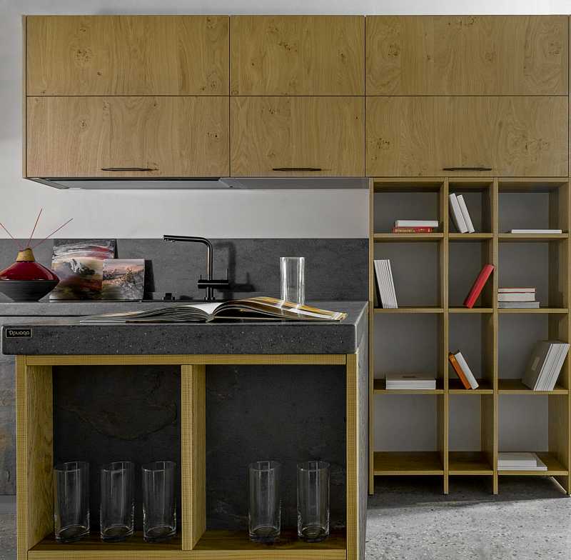 This is an innovative solution in the product line making your home closer to the eco style model as its front side decorations include real quartz and oak veneers. Furnished with modern handles and appliances, the suite will make the kitchen a warm center of your home.