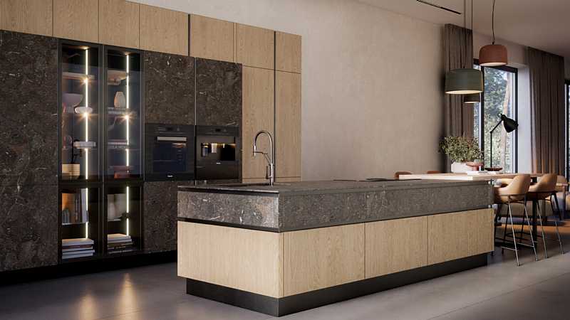 The second material of this kitchen layout is ceramics, which looks great with natural oak wood. The ceramic-covered island, high cabinets and countertops emphasize the luxurious and refined look of the kitchen.