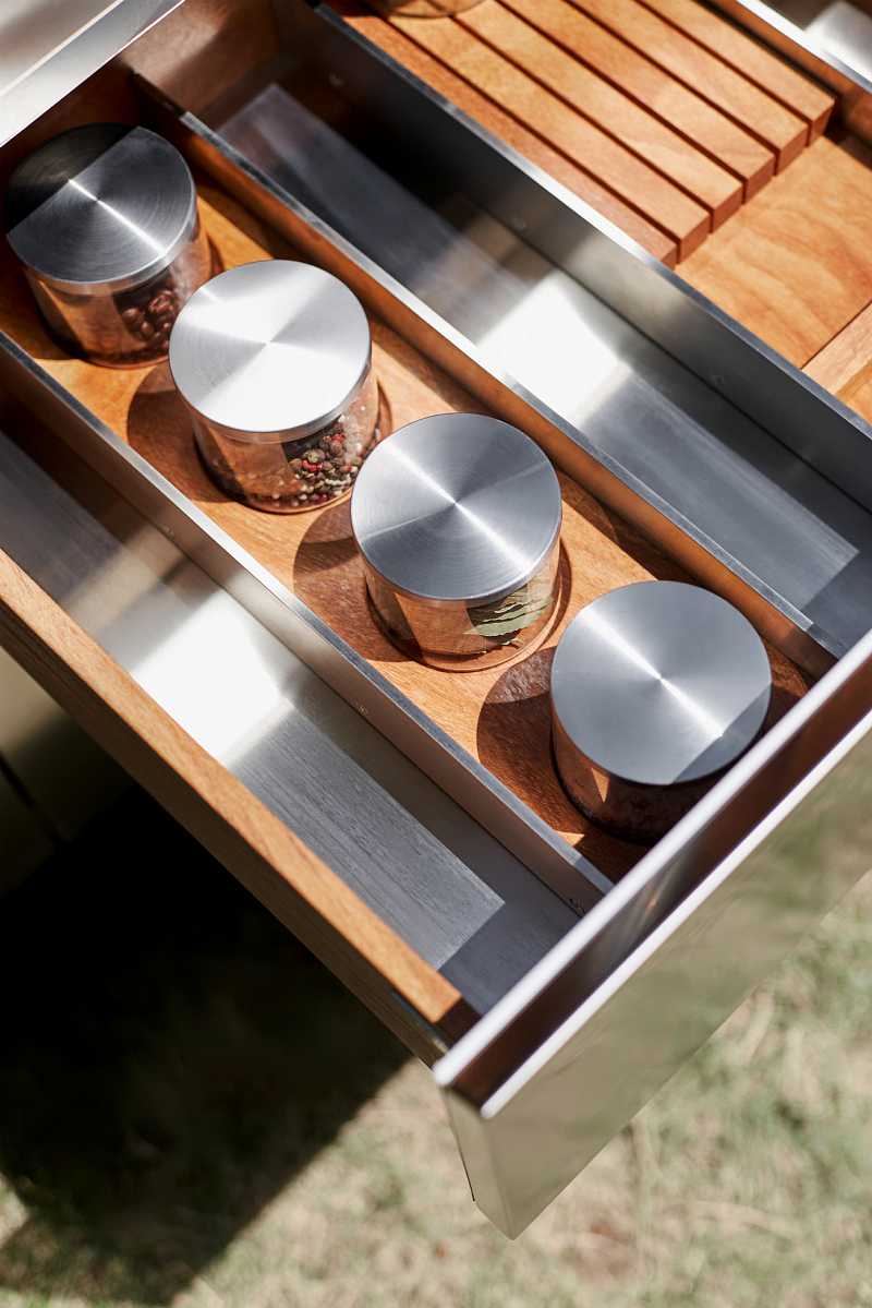 Thanks to the protective technology, the kitchen retains its impeccable appearance even in harsh climates. The special cosy atmosphere is achieved by using cumaru wood. This wood is not only pleasant to the touch, but also very resistant to damage, which, combined with stainless steel elements, ensures a long service life for the kitchen.